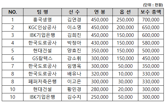 한편 이번 시즌 외국인 선수를 제외하고 한국 여자 프로배구 선수 평균 보수(연봉+옵션)는 1억 3400으로 나타났으며 흥국생명 김연경 선수는 보수 총액 7억으로 연봉퀸에 등극했습니다.