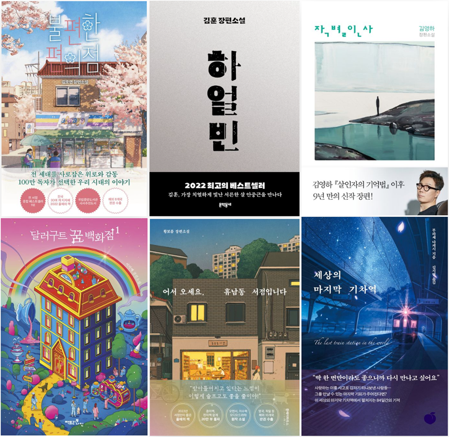 2022년 베스트셀러 소설 순위 다음으로는 김훈 <하얼빈>, 김영하 <작별인사>, 이미예 <달러구트 꿈 백화점>, 황보름 <어세 오세요, 휴남동 서점입니다>등 모두 국내 소설이 상위권을 점령했습니다.