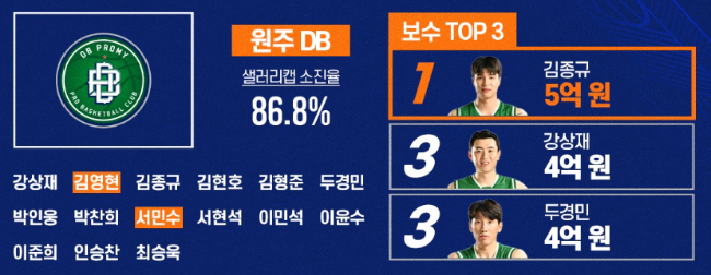원주 DB: 김종규 5억, 강상재 4억, 두경민 4억, 서민수 2억, 최승욱 1억 7천7백