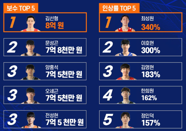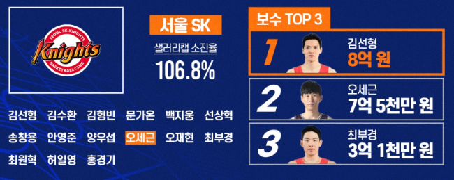 서울 SK: 김선형 8억, 오세근 7억 5천, 최부경 3억 1천, 허일영 2억 7천, 최원혁 2억