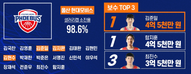 울산 현대모비스: 김준일 4억 5천, 함지훈 4억 5천, 최진수 3억 5천, 장재석 3억 3천, 서명진 2억 7천