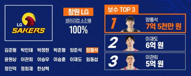 창원 LG: 양홍석 7억 5천, 이재도 6억, 이관희 5억, 정희재 2억 2천, 임동섭 1억 5백