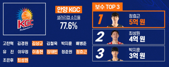 안양 정관장: 정효근 5억, 최성원 4억, 박지훈 3억, 배병준 2억, 김상규 1억 5천, 이종현 1억 5천