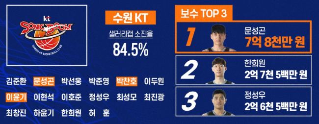 수원 KT: 문성곤 7억 8천, 한의원 2억 7천5백, 정성우 2억 6천5백, 하윤기 2억, 허훈 1억 9천5백