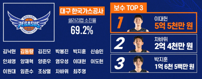 대구 한국가스공사: 이대헌 5억 5천, 차바위 2억 4천, 박지훈 1억 6천5백, 조상열 1억 3천, 김낙현 1억 1375