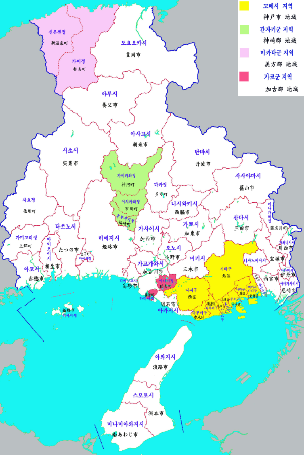 효고현의 현청 소재지는 '고베시'이며 그밖의 주요시는 가코가와시, 다카라즈카시, 아카시시, 아마가사키시, 니시노미야시, 히메지시 등이 있습니다.