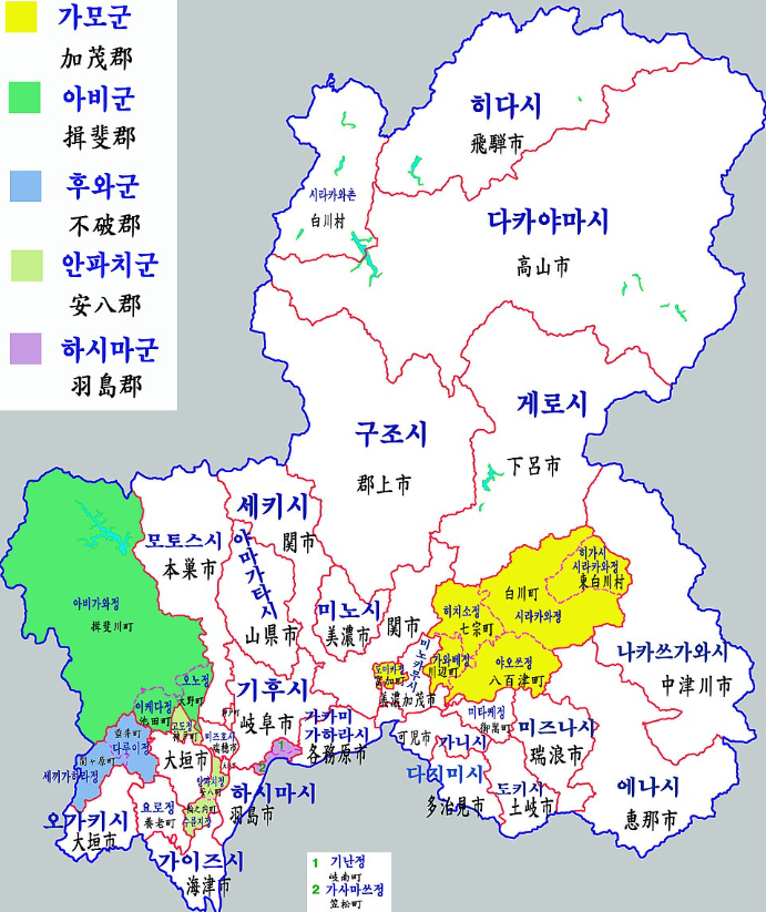 기후현의 현청 소재지는 '기후시'이며 그 밖의 주요시는 에나시, 오가키시, 카이즈시, 카니시, 구조시, 타카야마시, 타지미시, 히다시, 미노시, 미노카모시, 야마가타시 등이 있습니다.